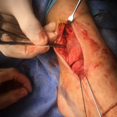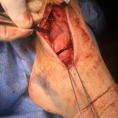 Intraop Pic of COmminuted DIstal Tibia Fracture and Medial Malleolus Fracture during ORIF. The two pins on the bottom are in the medial malleolar fracture fragent prior to reduction and fixation.