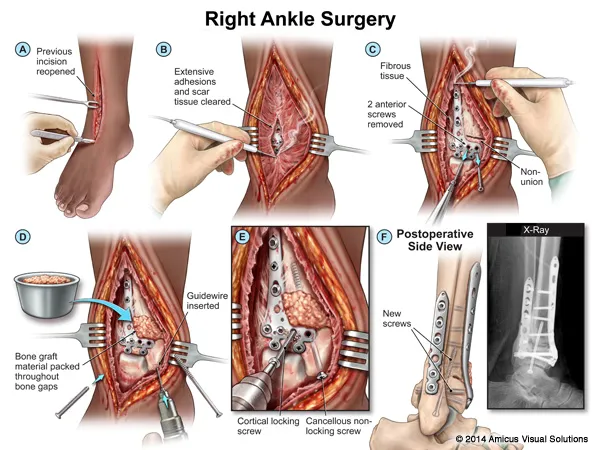 Post-surgical repair of the fracture with screws and plates used for