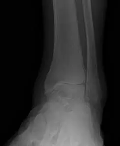 Ankle joint replacements are a reserved procedure for patients who meet certain criteria for functionality involving age, medical conditions, level of arthritis, and activity level, amongst others. The level of arthritis is typically severe and dibilitating as demonstrated in the x-ray image below. This person had a severe ankle fracture many years ago that was surgically repaired and later developed limiting arthritis to the point where they could no longer use their ankle because of pain. There is absence of joint space at the ankle joint along with remodeling of the bones around the ankle due to degeneration of the joint. The abnormal appearance of the thin bone called the fibula is a result of not fixing this bone when the patient had the original surgery. This is referred to as malunion.