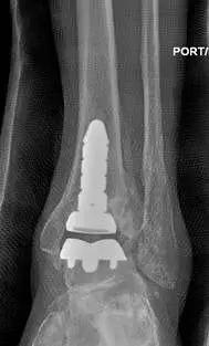 The following are images after surgical replacement of the ankle joint with a mobile bearing ankle prosthetic called the S.T.A.R. (SBI). This replacement joint will function similarly to a normal anatomical joint, allowing the patient normal function in daily activities, but was not designed to take repetitive use during more intense athletic activity. The joint has a polyethylene spacer between two metal parts that acts as shock absorber and gliding agent similar to cartilage. There is physical therapy that is required after surgical joint replacement in order to get the patient back to funcional capacity.