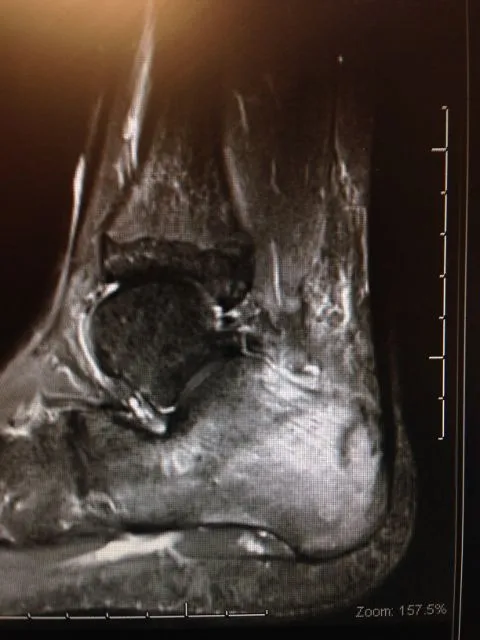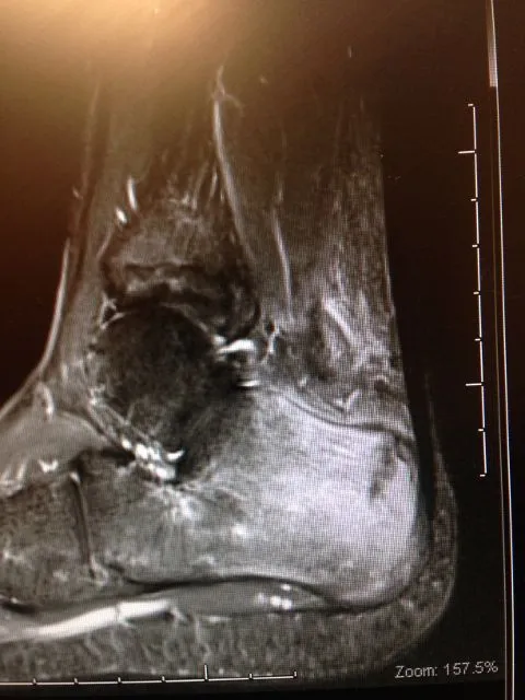 - Occasionally seen with low-grade swelling on the outside of the heel.