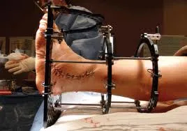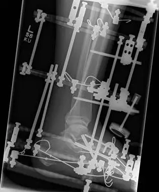 The condition easily progresses to a point where the foot is collapsed and pressure points present themselves in the center of the foot where the foot collapsed, predisposing the individual to pressure wounds also due in part to the lack of sensation. When this occurs the wound must be healed with wound care in conjunction with off-loading of the area with one of the above-mentioned devices. The final step in treatment would be surgical reconstruction of the foot or ankle, which in most cases involves both internal fixation of the bones and external fixation with a frame (pictured below).