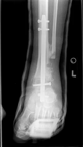 After over a year of wound care to help the wound on the inside of the ankle heal, the patient was finally stable enough to have surgery to realign the foot underneath the ankle, requiring a fusion of the ankle and subtalar joint with a surgical nail (rod).