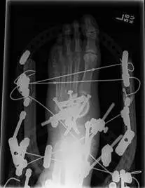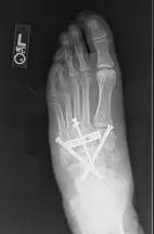 Below are images of Charcot deformity in the midfoot and reconstructive surgery involving an external fixator, which is the metallic structure that you see outside of the area of the foot and leg with pins inserted into the foot and leg to allow support and reduction of the deformity to allow healing.