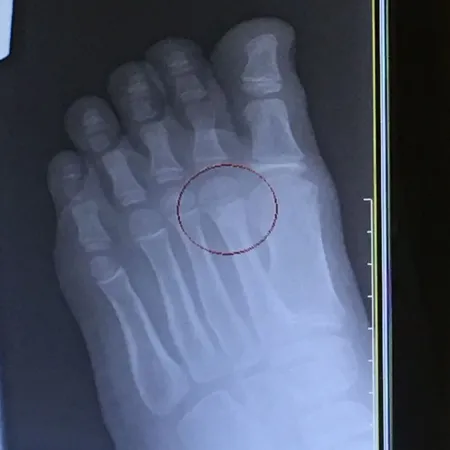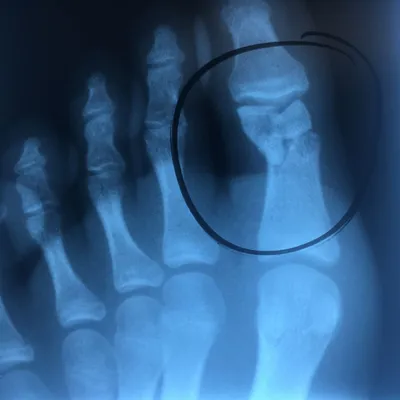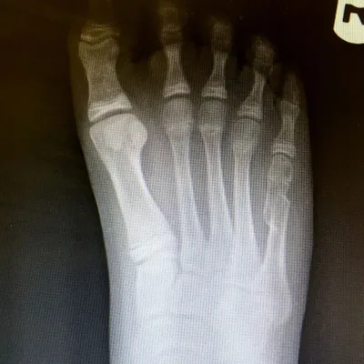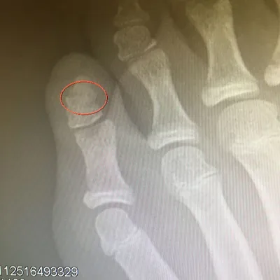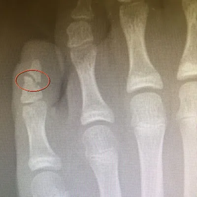 Below is an x-ray image of an extra-articular fracture of the proximal phalanx of the hallux (great toe) of a child. the fracture line does not enter the joint.