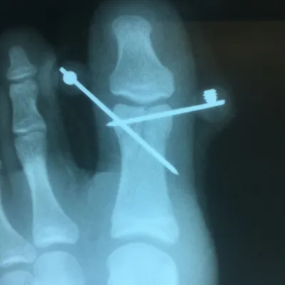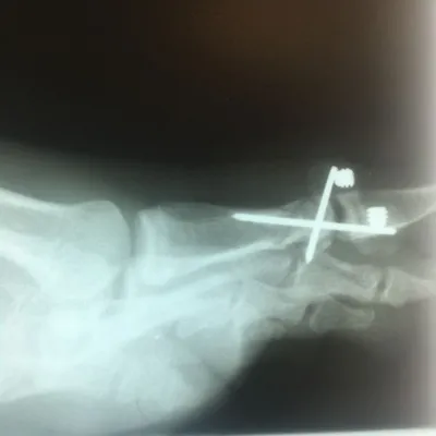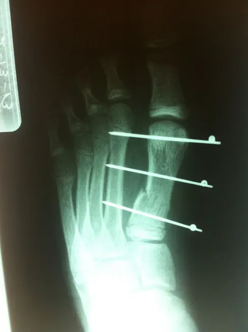 This is post-operative x-ray of a repair of a fracture of the long bone of foot connected to the great toe, There are three pins holding the fracture fragments in place, and once this heals the pins are removed.