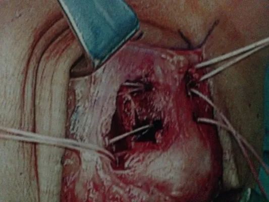 Picture of lateral stabilization surgery in which the ATFL is reattached to the fibula through drill holes and suture.