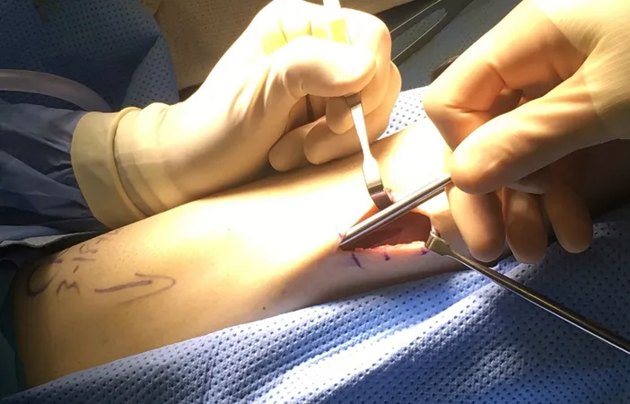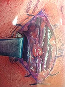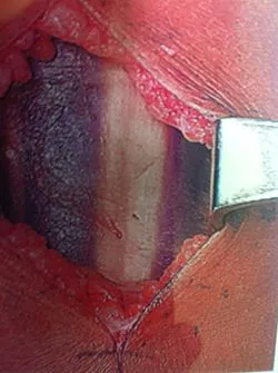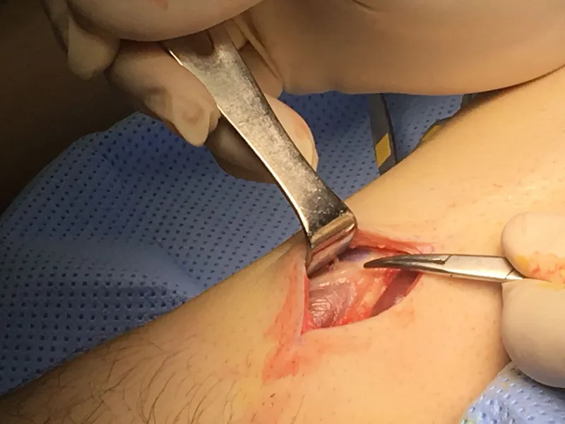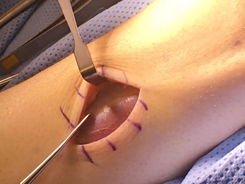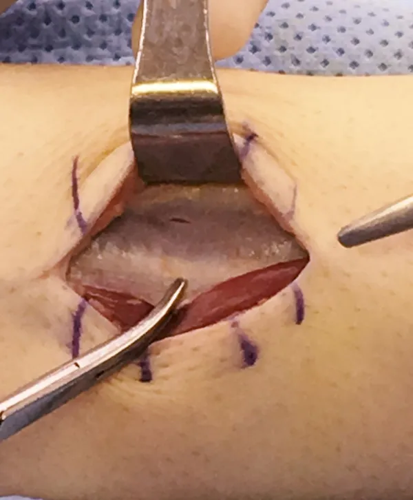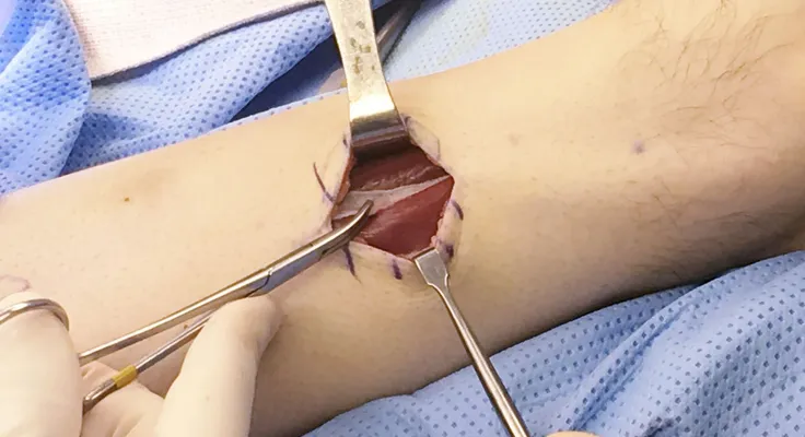 Intra-operative image of open fasciiotomy for chronic exertional compartment muscle syndrome where the bulging muscle belly can seen at the center of the image from build up of pressure within the compartment.