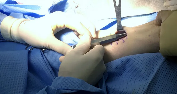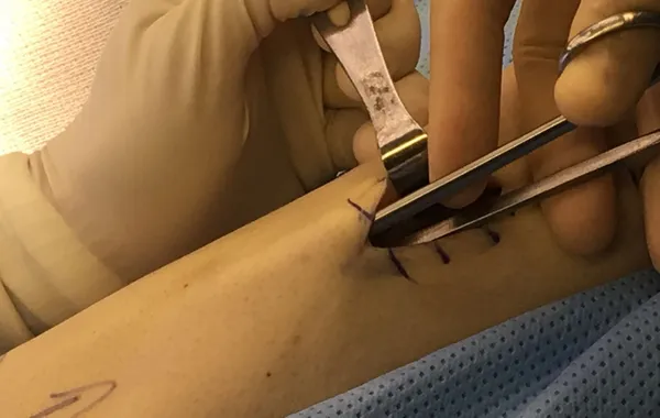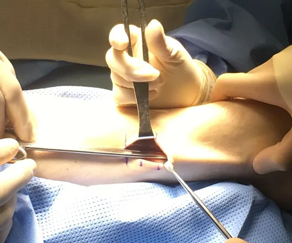 Lateral has been released. A small stab can be seen at the top of the fascia under the large instrument. This is the guide hole for the anterior release.