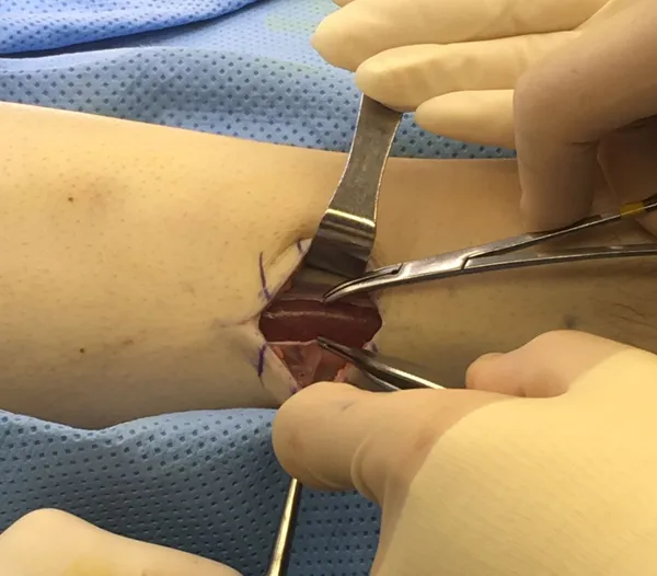 The picture below demonstrates the fascia overlying the tissue being lifted by the forceps at the top of the picture.