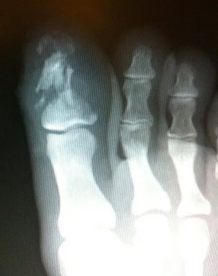 Below is an x-ray of a severely comminuted fracture of the distal phalanx of an adult foot. Although this is a bad injury none of the fractures enter the interphalangeal joint.
