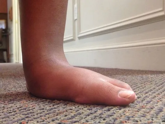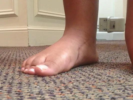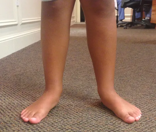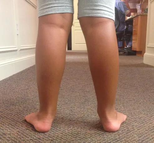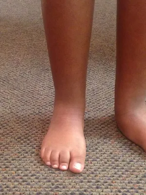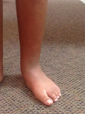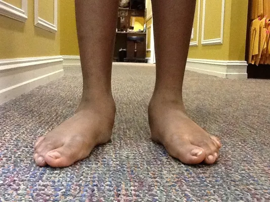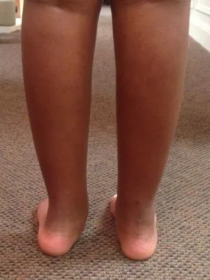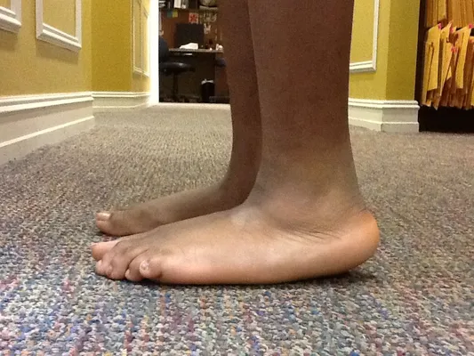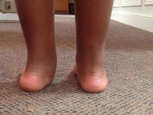 - When viewing the child from behind, the heel appears to be turned out and the arch bulges on the inside of the foot just below the ankle.