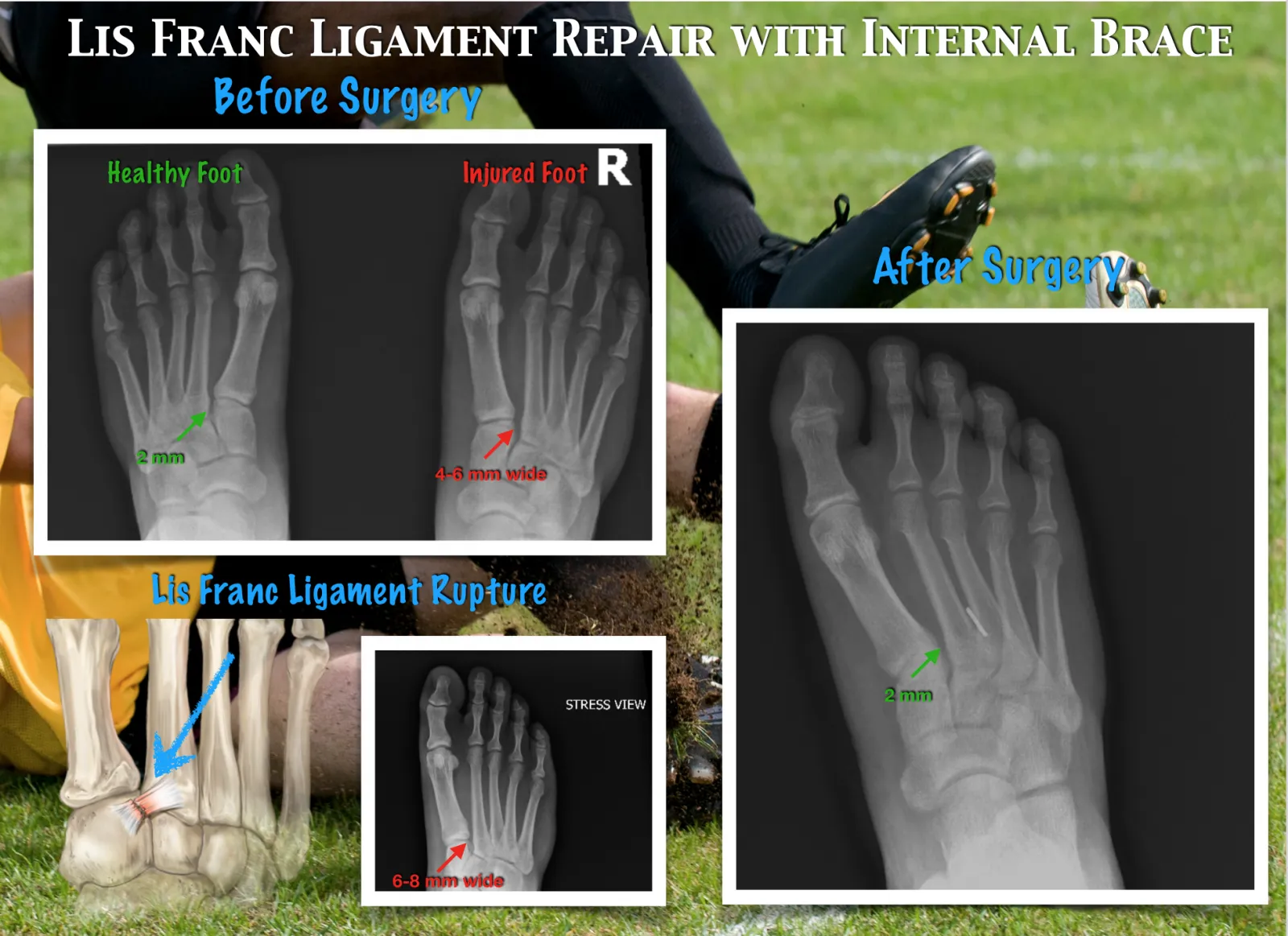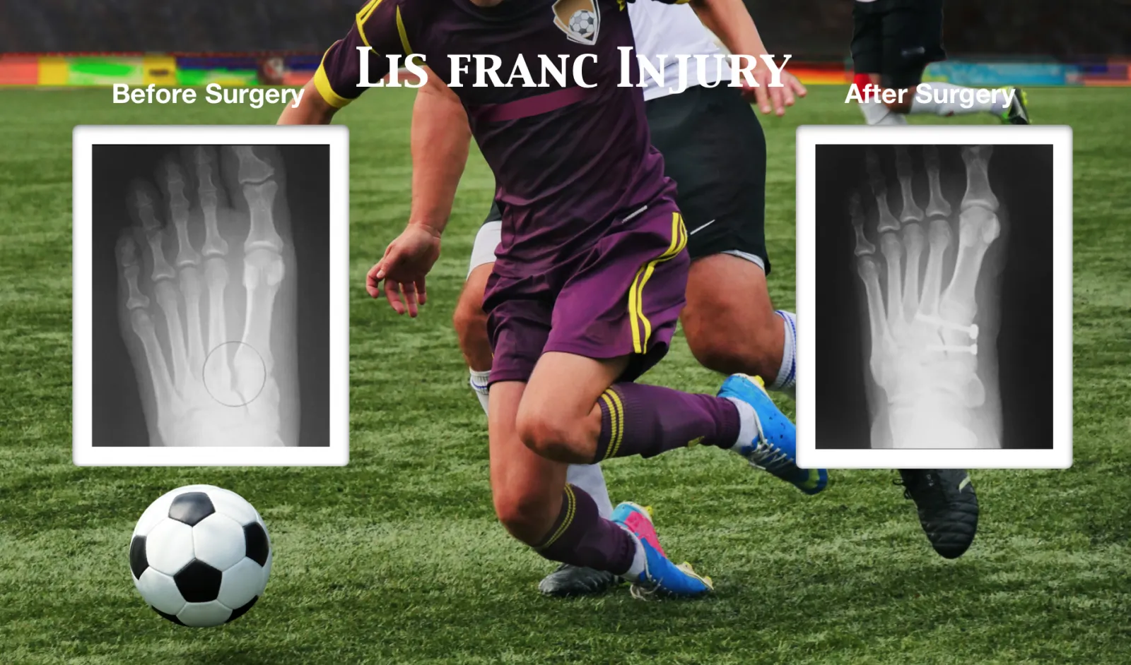 Below is the case of a young female athlete was injured while playing soccer, she had pain and swelling at the midfoot. MRI imaging confirmed ligament rupture. The procedure was done percutaneously with flourscopic guidance. Pictured on the left is pre operative and post operative x-ray to the right. She went on to heal uneventfully after physical therapy, and has since returned to playing soccer.