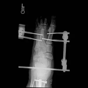 This is an example of an injury to the arch of the foot involving the Lis Franc's ligament between the base of the 2nd metatarsal and the medial cuneiform bone. This is a very important stabilizing ligament of the foot (left). This injury is repaired surgically with screws, pins and occasionally surgical plates. This case was corrected with a combination of screw and pins (right).