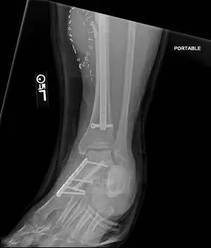 These are pics of the plate and screws stabilizing the fractures after ex fix was removed. An IM rod was also placed for a tibia fracture.