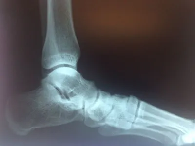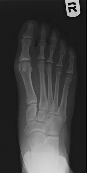 In the x-rays below there are fractures seen in the midtarsal bones that can occur with a high impact twisting injury where the foot is caught in something like the stirrup of a horse saddle or from direct high impact traums to the middle of the foot. The fractures can be seen from a view at the top of the foot (left) and side of the foot (right). This injury requires open reduction with internal fixation in order to re-align the fractured bones and prevent disability (Bottom left).