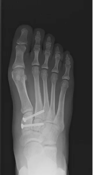 The images below demonstrate Lis Franc's ligament rupture with increased spacing between the medial cuneiform and the intermediate cuneiform. The ligament is attached between the base of the 2nd metatarsal and the lateral aspect of the medial cuneiform (left). The post-surgical repair with screw fixation (right) shows reduction in that aforementioned space between the cuneiforms re-establishing the stability of the medial midfoot.
