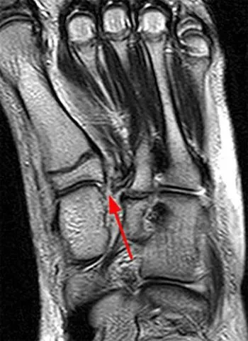 Below is an MRI image demonstrating the location of the Lis Franc's ligament with the ligament ruptured (red arrow).