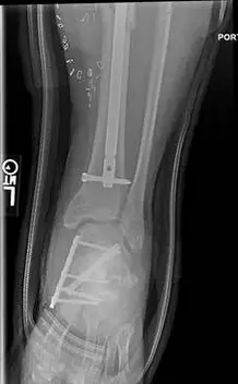 These are pics of the plate and screws stabilizing the fractures after ex-fix was removed. An IM rod was also placed for a tibia fracture.