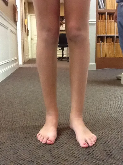 The photographs below demonstrate internal rotation of the femurs above the knee and external rotation of the tibia-fibula below the knee causing the mal-alignment. The image to the left is a good example of "squinting" of the knees as they point inward in this condition.