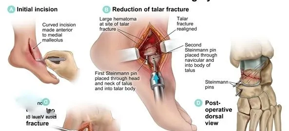 Talar neck fractures can be devastating injuries that can occur from forcing the foot up into the leg. It can occur in motor vehicle accidents when somebody pushes their foot down on a brake or pushes their foot down on the floorboard at impact. Injuries to the talar neck in pediatric patients are treated similar to the way they are in adults. All nondisplaced fractures can be treated conservatively with a cast below the knee. These must be treated nonweightbearing until the fracture has healed. Other fractures may be displaced, which also disrupt to the blood supply to the bone. Although these are uncommon, they may be devastating injuries to the bone and the joints around them. Fractures would need to be immediately reduced and fixed to avoid long-term problems. Even with the best procedures and fixation of these fractures, small areas of bone can still be devoid of blood supply, creating problems.