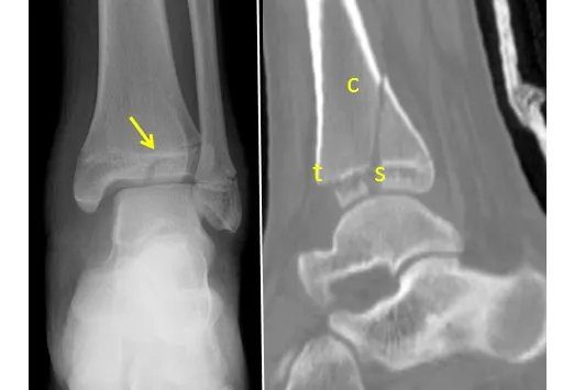 The Salter Harris IV fracture line begins at the joint surface of the epiphysis, extends directly through it, and continues through all layers of the physis and into the metaphysis. There can be significant rotation and displacement of the fracture. The two major issues in the treatment are prevention of premature closure and preservation of the joint surfaces. Accurate anatomic reduction is necessary to meet both goals; otherwise these fractures lead to growth arrest. Open anatomic reduction is preferred for these injuries if displacement occurs.