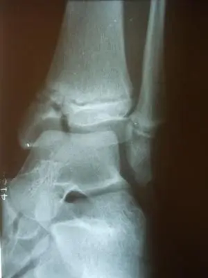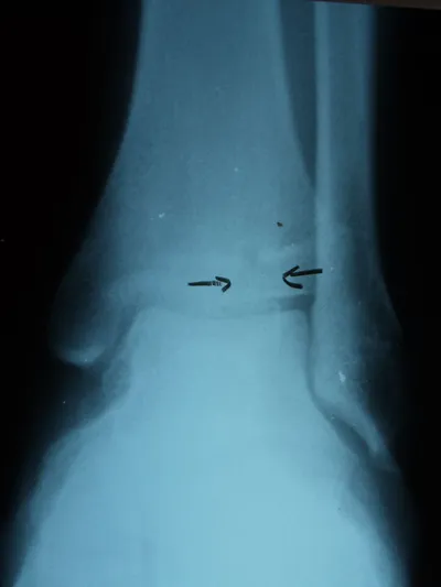 The x-ray below shows a Salter III type injury to the tibia epiphysis indicated by the arrows.
