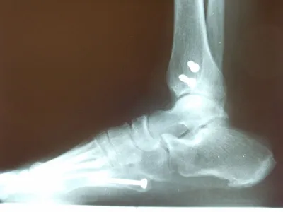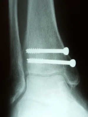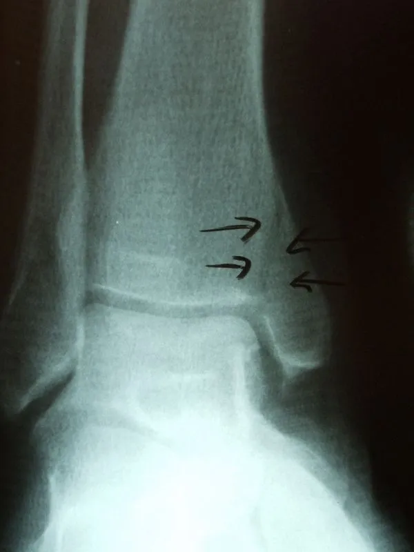 This is a picture of a medial malleolar stress fracture prior to percutaneous screw fixation
