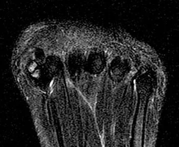 The sesamoids can be normally in two or more pieces. These pieces are connected by cartilage. This is referred to as a synchondrosis. Cartilage has a very poor blood supply to the area. When an injury occurs to the synchondrosis it may appear as a fracture on an x-ray but it is not a fracture of the bone but a fracture of the cartilage connecting the bones. Injuries to the synchondrosis can be very difficult to treat. X-rays may be taken on the unaffected side to compare. However, both sides may have what appears to be sesamoids in multiple pieces. When pain persists, then an MRI may be necessary to fully evaluate the injury. We often see bone marrow swelling on two or more bone segments, which indicates the injury to that area. Clinically, there is pinpoint tenderness to the bone on the ball of the foot. Swelling may or may not be present. There will be difficulty walking in long strides or running on the ball of the foot. Dancing can become near impossible because of the pain that patients may experience. Treatment includes immobilization in a boot and often nonweightbearing to allow the area to heal.